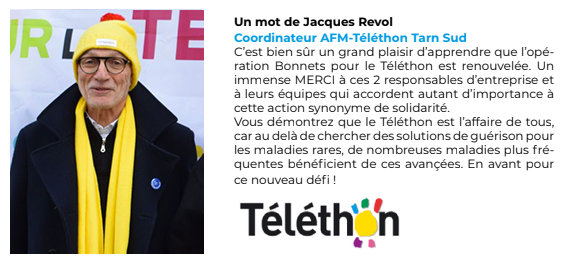 En témoignent Jacques Revol le coordinateur de l’AFM-Téléthon du Tarn Sud et nos deux dirigeantes et amies de longue date : Christel Anglade Moncéré pour Ma Petite Mercerie et Myriam Joly pour Missegle.