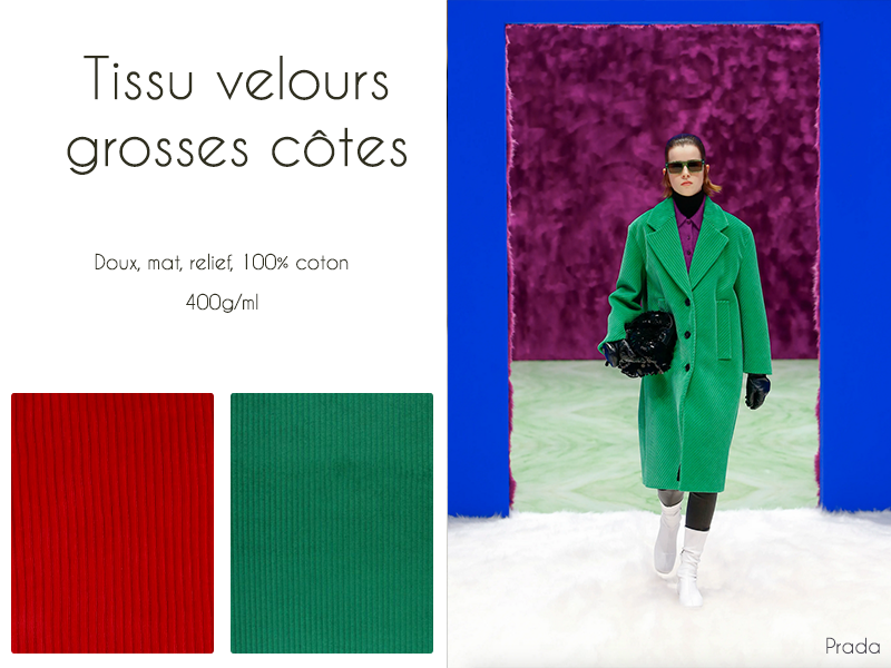 Parmi les tissus que l’on veut voir partout dans notre dressing, on demande le velours grosses côtes. Doux confortable et plutôt dans l’air du temps, on opte pour sa version rouge qui colore la grisaille des jours qui raccourcissent. Envie de tenter une couleur différente ? Optez pour le vert dans une nuance lumineuse, il sublimera vos manteaux et vos salopettes !