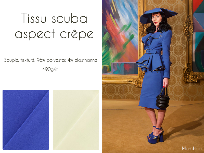 En décembre, on demande aussi le tissu Scuba. Si si, on ose, on se lance dans la découverte de ce tissu inspiré des tissus techniques du monde nautique. Le tissu scuba aspect crêpe est un type de jersey très serré composé d’un envers crêpé. Son avantage ? Il est très résistant et rendra vos tenues durables et originales.