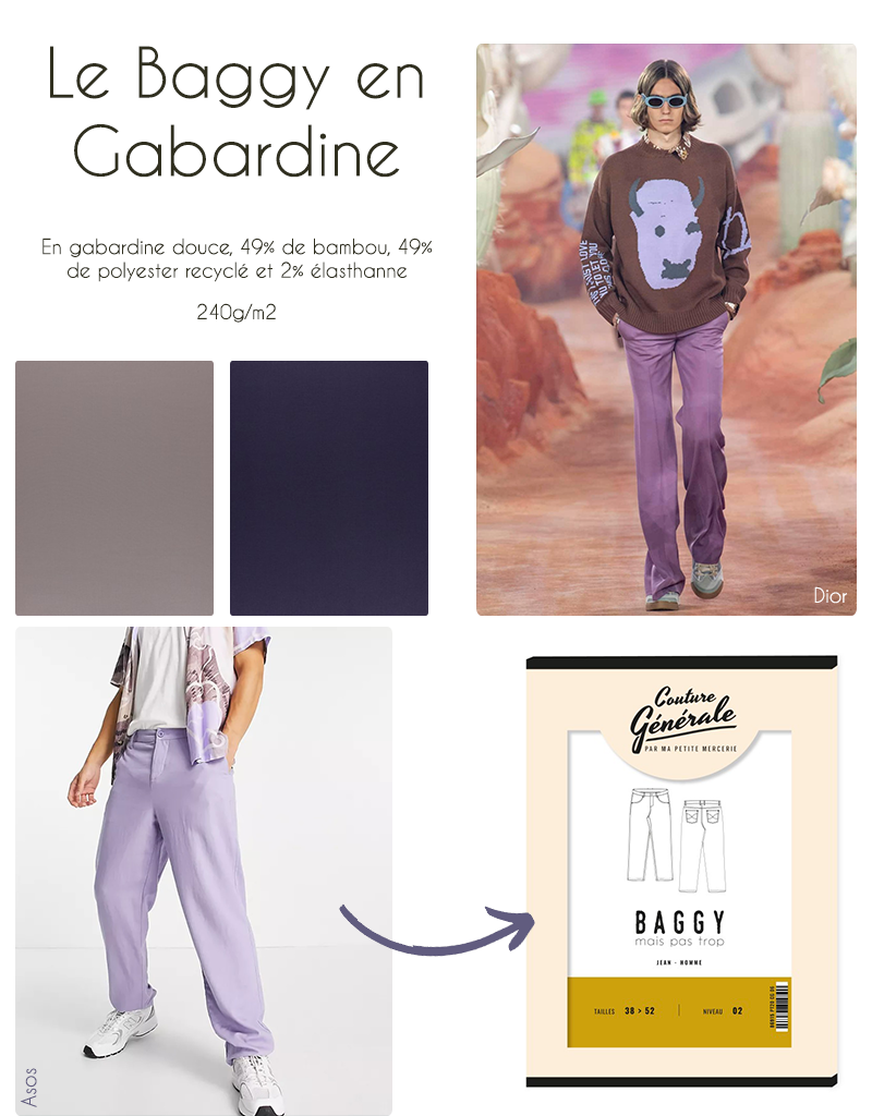 En résumé, il est Baggy mais pas trop ! Cousez-le dans notre nouvelle gabardine. Composée à 49% de fibre de bambou, cette étoffe est plus douce encore qu’un tissu gabardine en coton classique et se travaille sans problèmes à l’aide d’une aiguille standard.