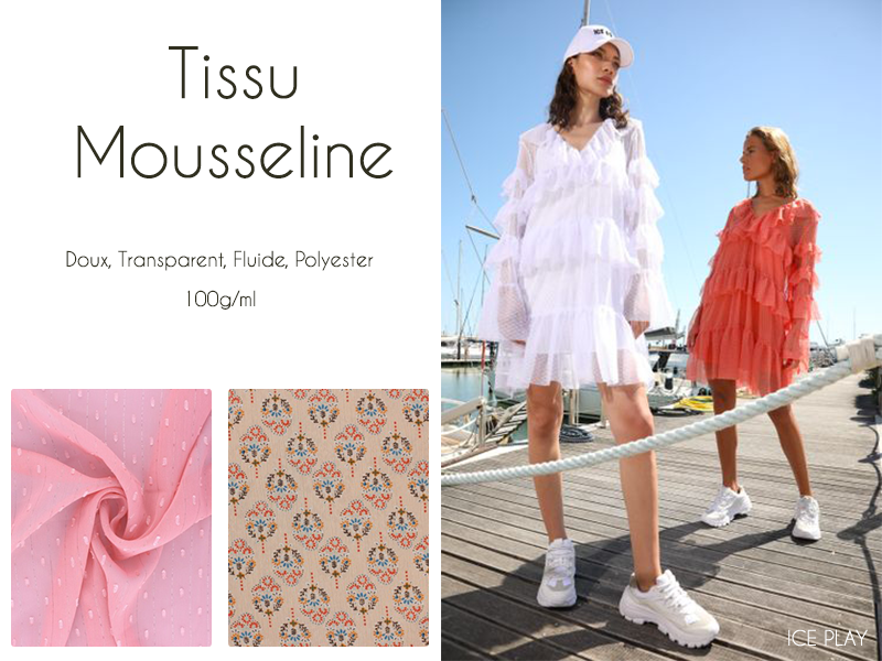 Ce mois-ci, c’est au tour de la mousseline de faire son grand retour dans nos piles de tissus à coudre. Connue pour son tombé vaporeux et sa texture douceur, le tissu mousseline joue avec vos cousettes en multipliant ses couches sur vos jupes et robes à volants.