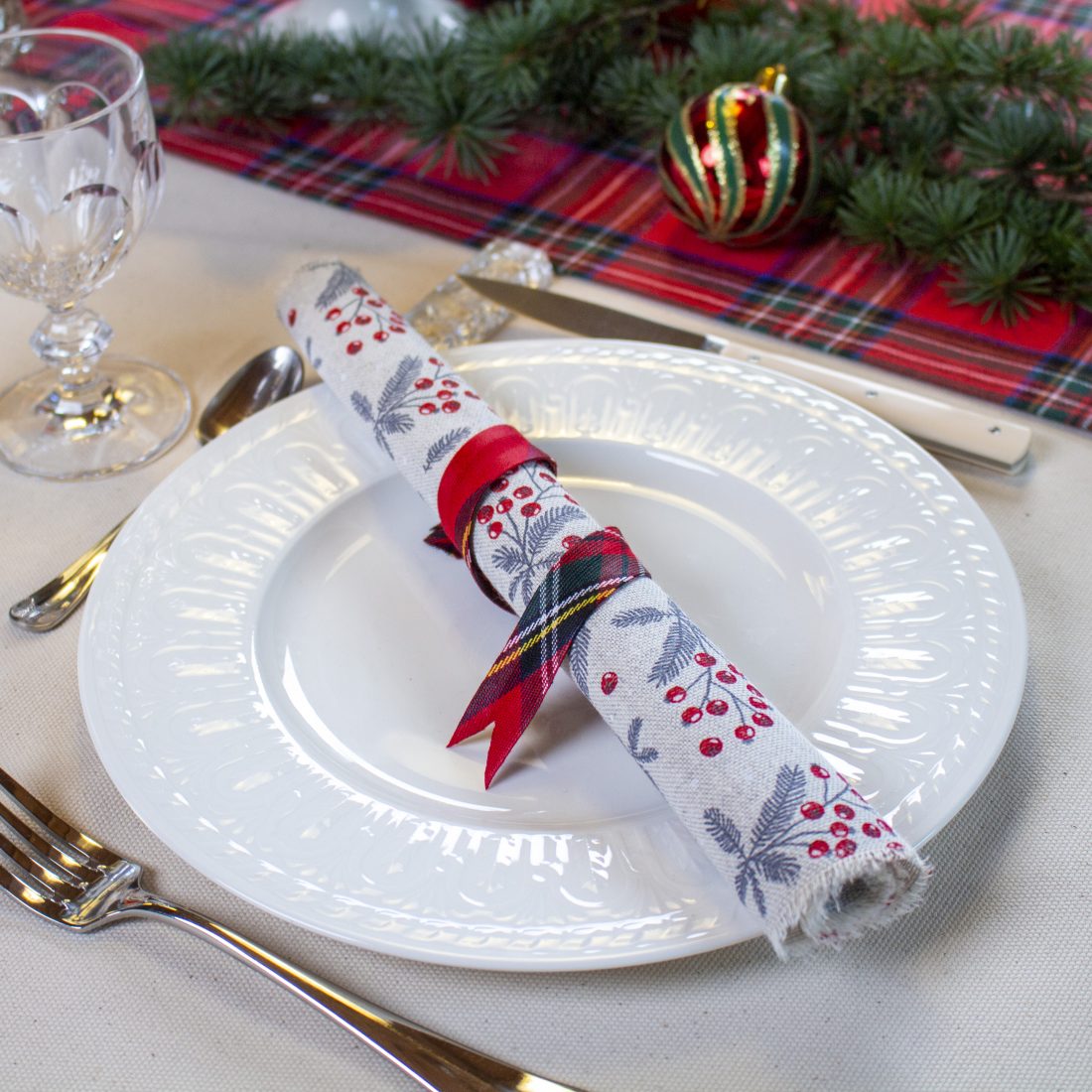 Pour les serviettes de table, nous avons opté pour le tissu en coton à motif Noël assorti à un ruban à carreaux également.