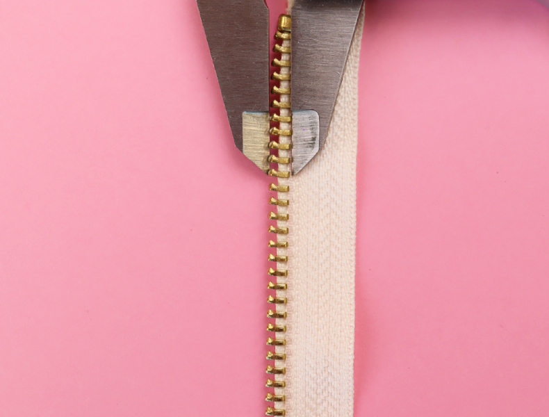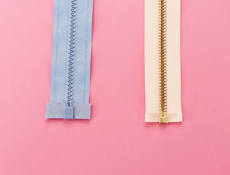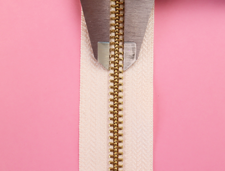 1. Fermetures à glissière métalliques : souvent en laiton, chaque dent de la chaîne métallique est fixée par pression sur le ruban.