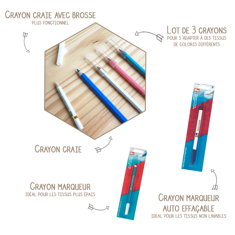 Pour les tissus lavables on choisit le crayon marqueur effaçable à l’eau. Les traits sont plus visibles que les crayons, il convient donc à des tissus plus épais.