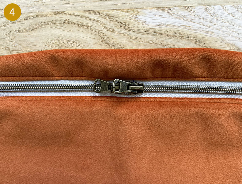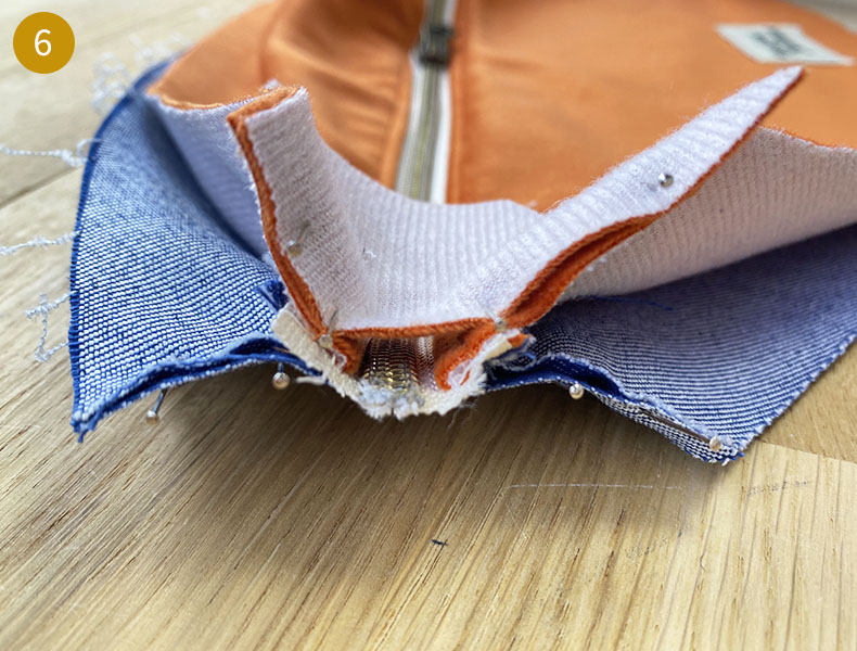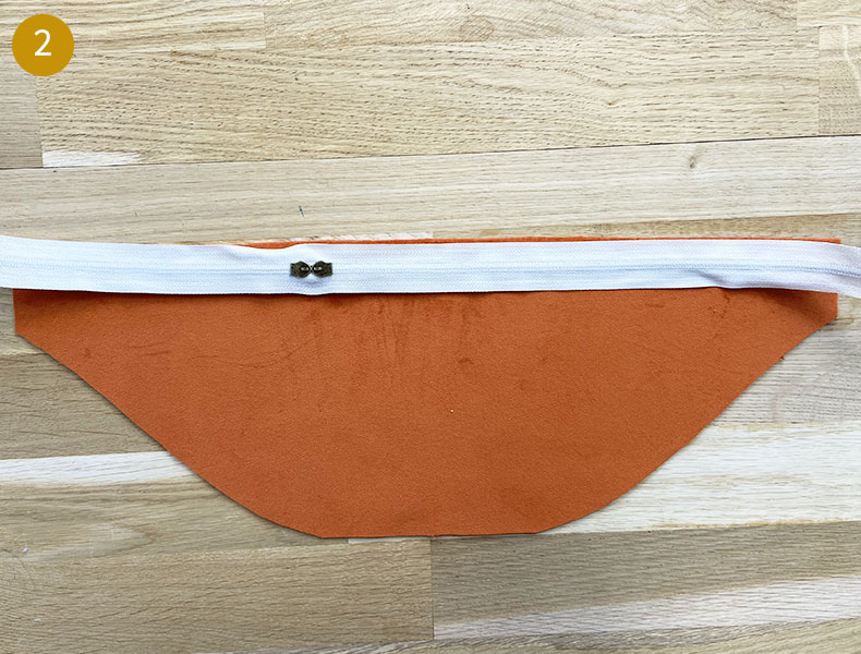 • Posez votre fermeture glissière endroit contre endroit sur la pièce, rabat devant sur la partie basse (arrondi)