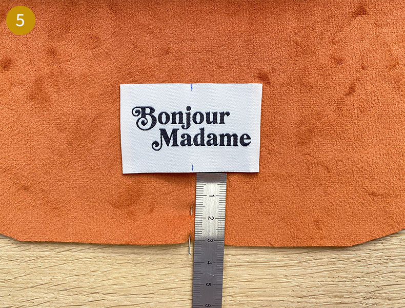 Si vous avez choisi d’ajouter une étiquette ou un écusson sur le devant de votre banane, il est temps de la positionner. Positionnez votre étiquette sur le milieu devant de votre tissu velours à 3 cm du bas et surpiquez tout le tour.