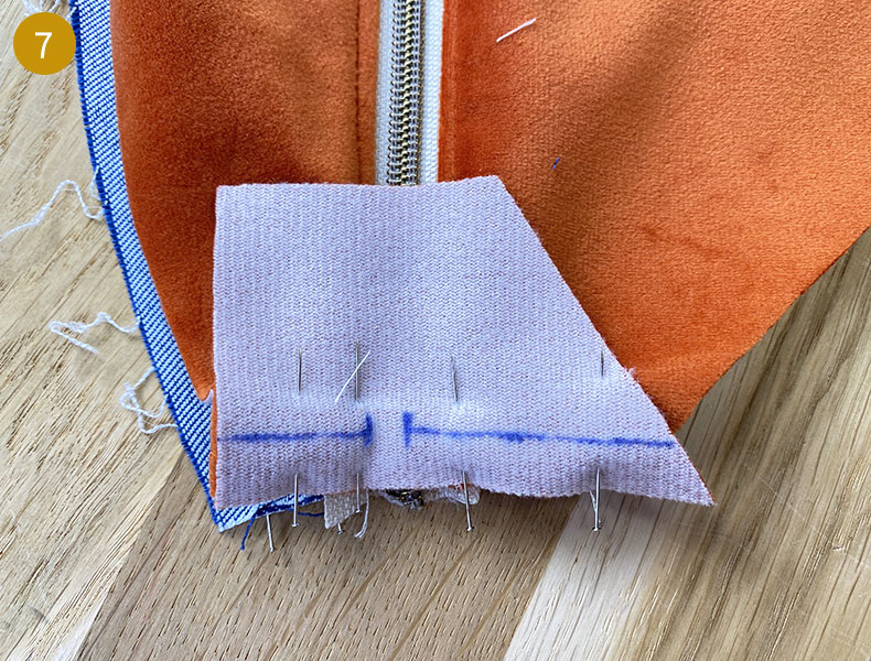 • Posez votre fermeture glissière envers contre endroit du tissu doublure rabat partie basse.