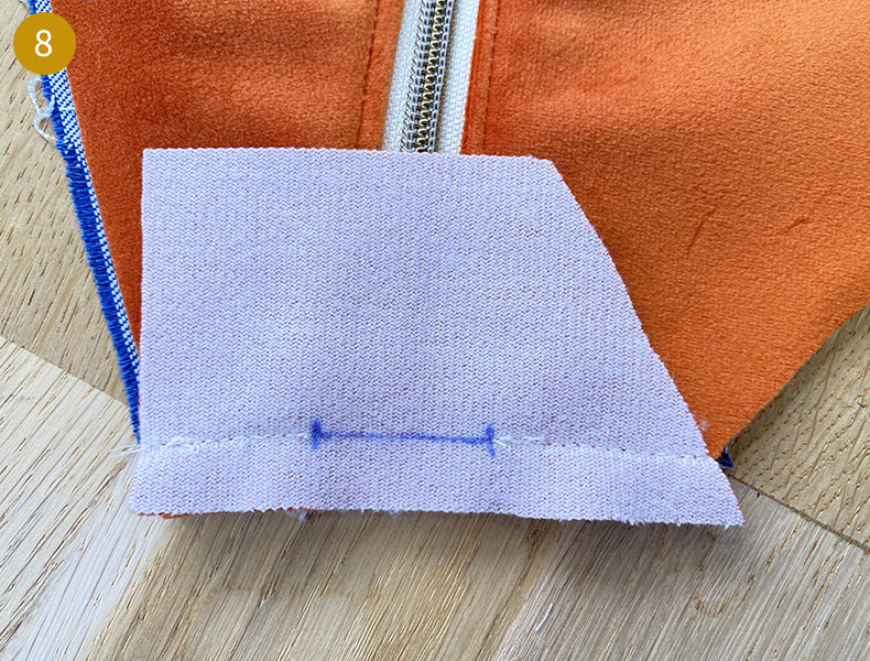Piquez maintenant sur la fermeture uniquement en prenant votre tissu velours et votre doublure ensemble (environ 1,5 cm de couture).