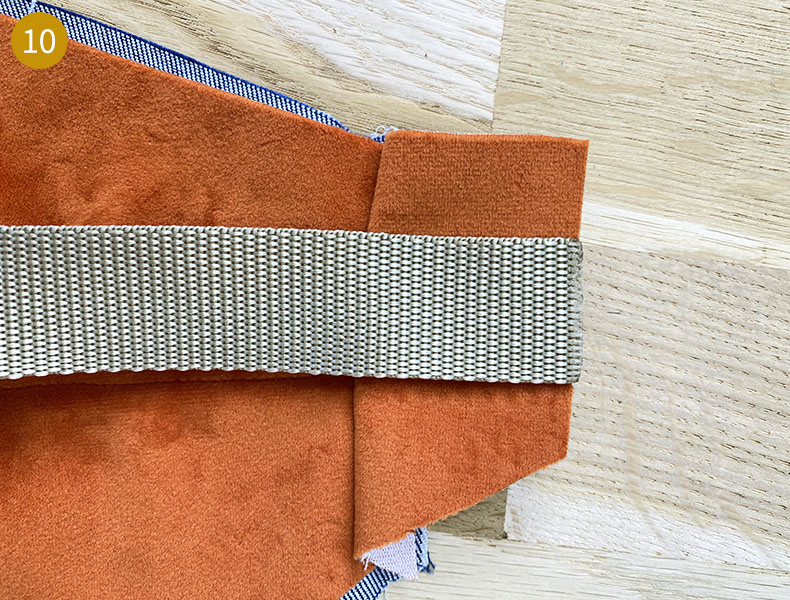 Puis, positionnez la sangle au milieu du côté gauche, endroit velours de la banane face à vous. Puis réalisez une piqûre de maintien à 0,5 cm du bord au point zigzag.