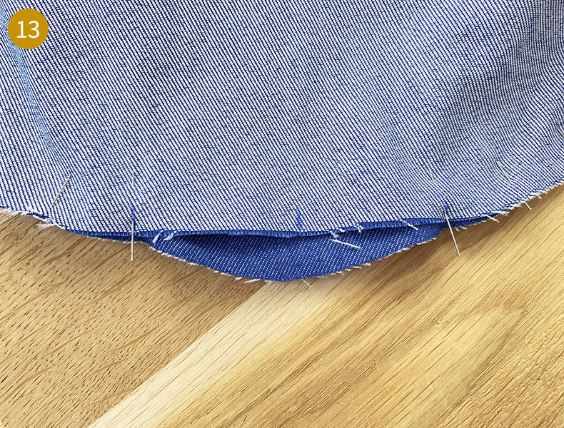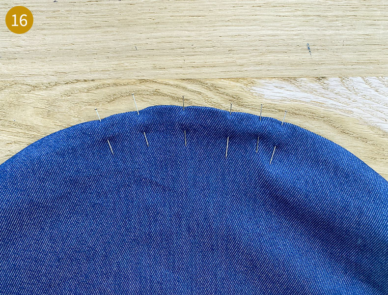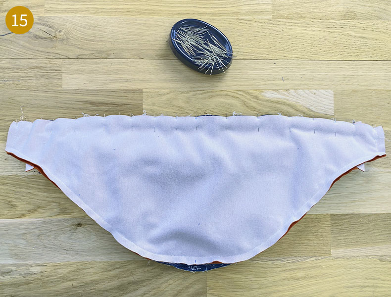 • Pour coudre plus facilement l’arrondi, épinglez le milieu puis chaque extrémité et enfin, rajoutez des épingles entre (cela permet de répartir uniformément votre surplus de tissu !)