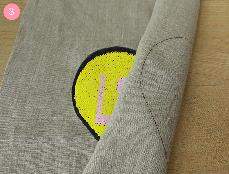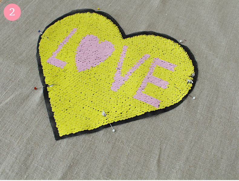 Découpez 3 coupons de lin : 40 cm x 40 cm, 40 cm x 16 cm et 40 cm x 32 cm puis épinglez le cœur au centre de votre coupon de lin 40 cm x 40 cm.