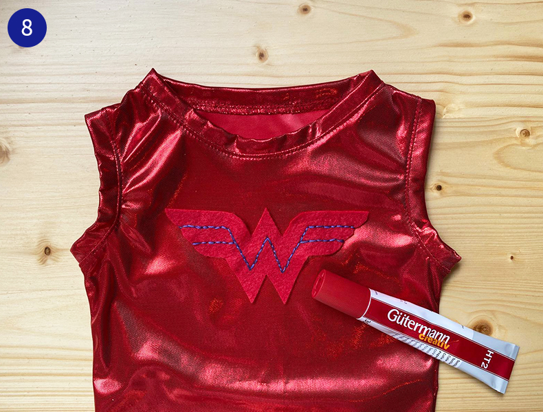 Après avoir découpé dans la feutrine votre écusson, vous pourrez le coller sur le devant du débardeur à l’aide de la colle textile.