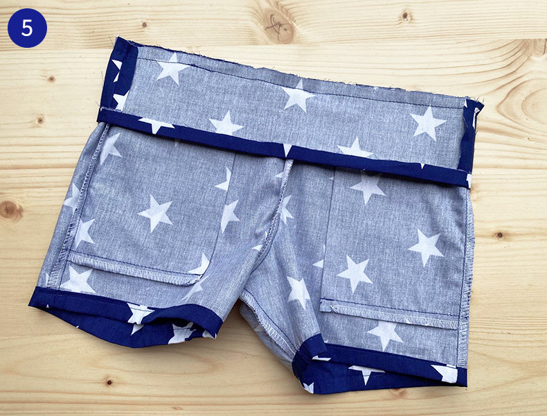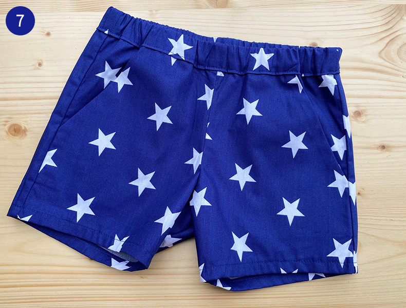Repassez bien au niveau de la couture puis retournez la poche sur l’envers du short. Pliez la poche en deux vers l’extérieur du short en suivant les crans. Piquez à 1 cm du bord le bas de la poche. Surjetez ou faites un point zig zag. Par une piqûre à 2 mm du bord maintenez la poche sur le haut et le côté du short.