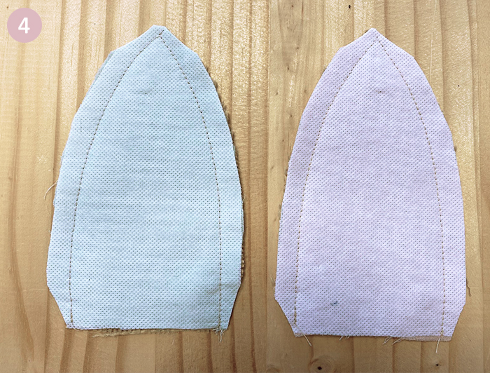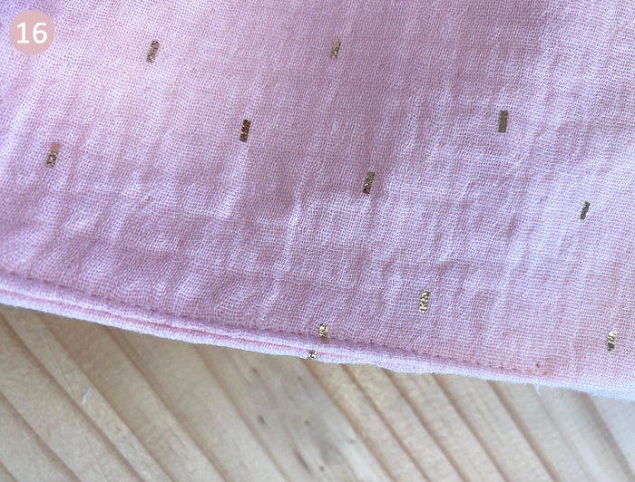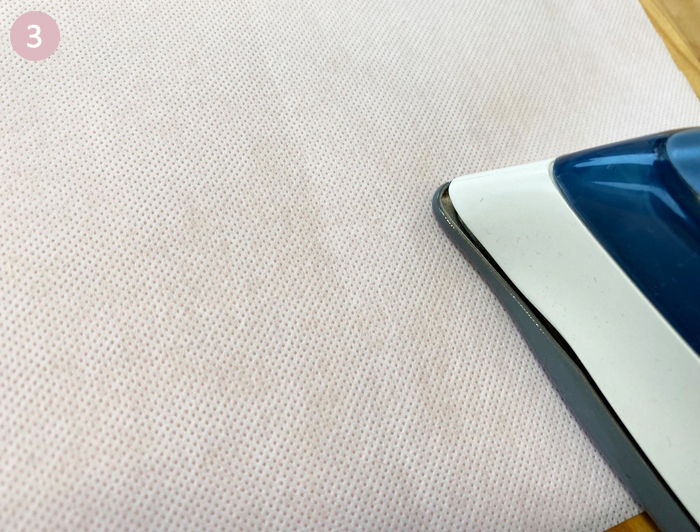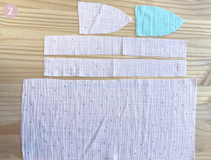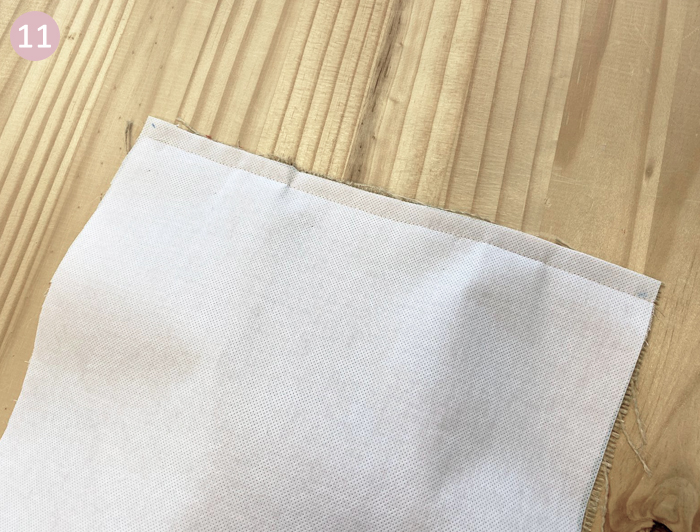 Thermocollez les oreilles, les anses et le grand rectangle de la doublure. Pour ce faire, appliquez la face rugueuse du thermocollant contre l’envers de la double gaze, repassez lentement au fer sans vapeur.