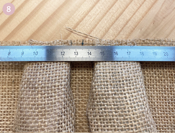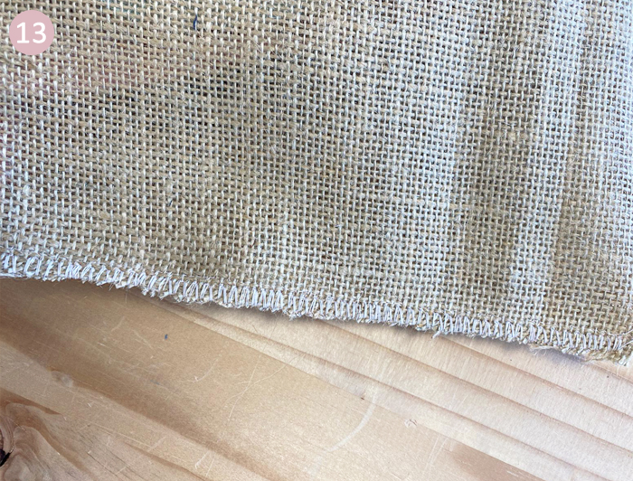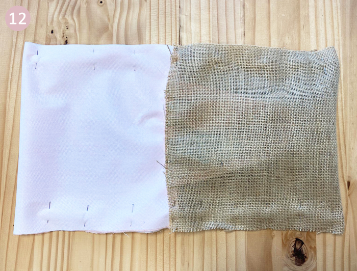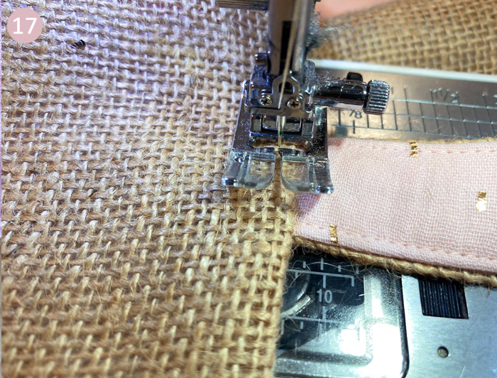 Piquez tout le long d’un côté et de l’autre veillez à laisser une ouverture de 8 cm côté doublure. Faites un point zig zag au niveau des coutures de la toile de jute (facultatif).