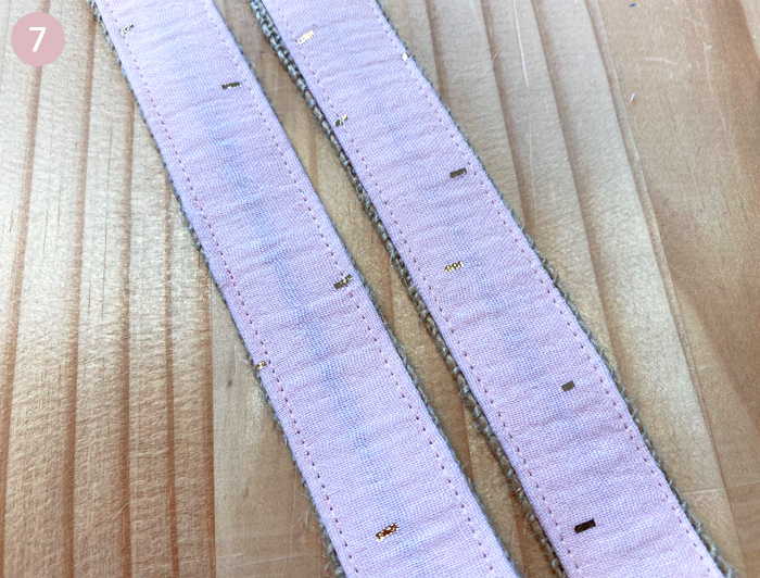 Piquez ensuite les deux biais (jute+doublure) l’un sur l’autre pour confectionner les anses.