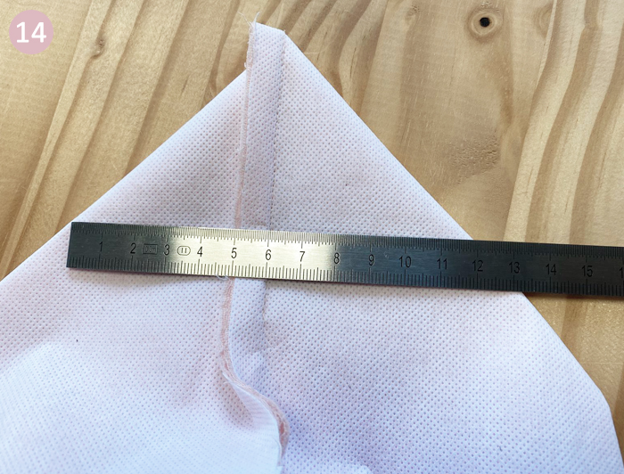Façonnez vos angles bien à plat. Mesurez 12 cm et tirez un trait. Aidez-vous du repère de la couture d’angle qui doit être à 6 cm du bord.
