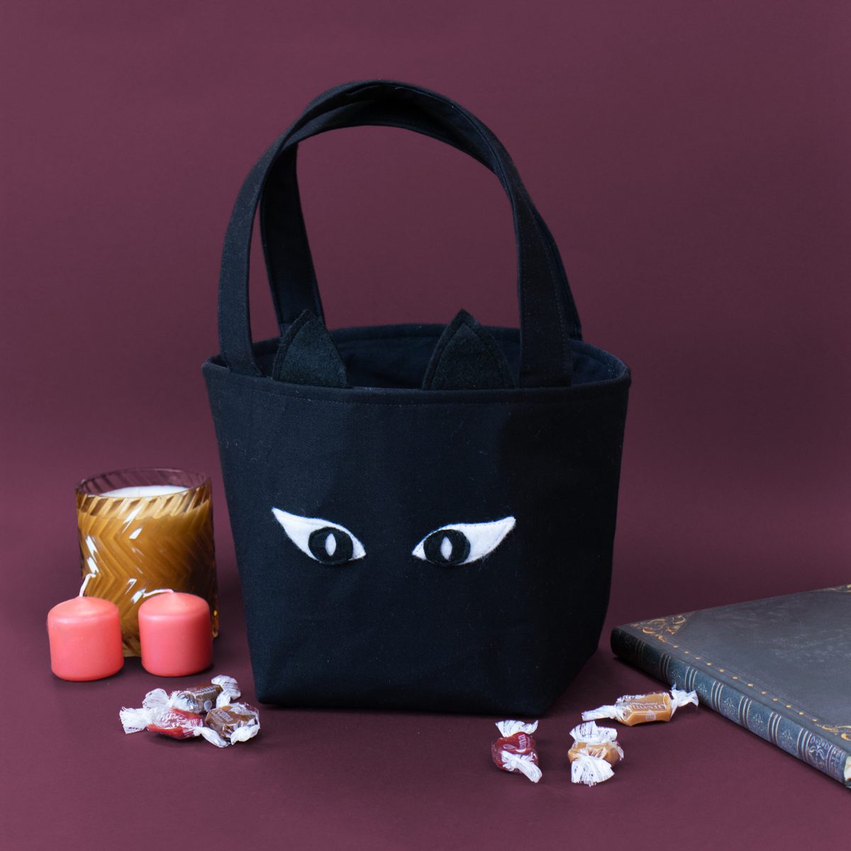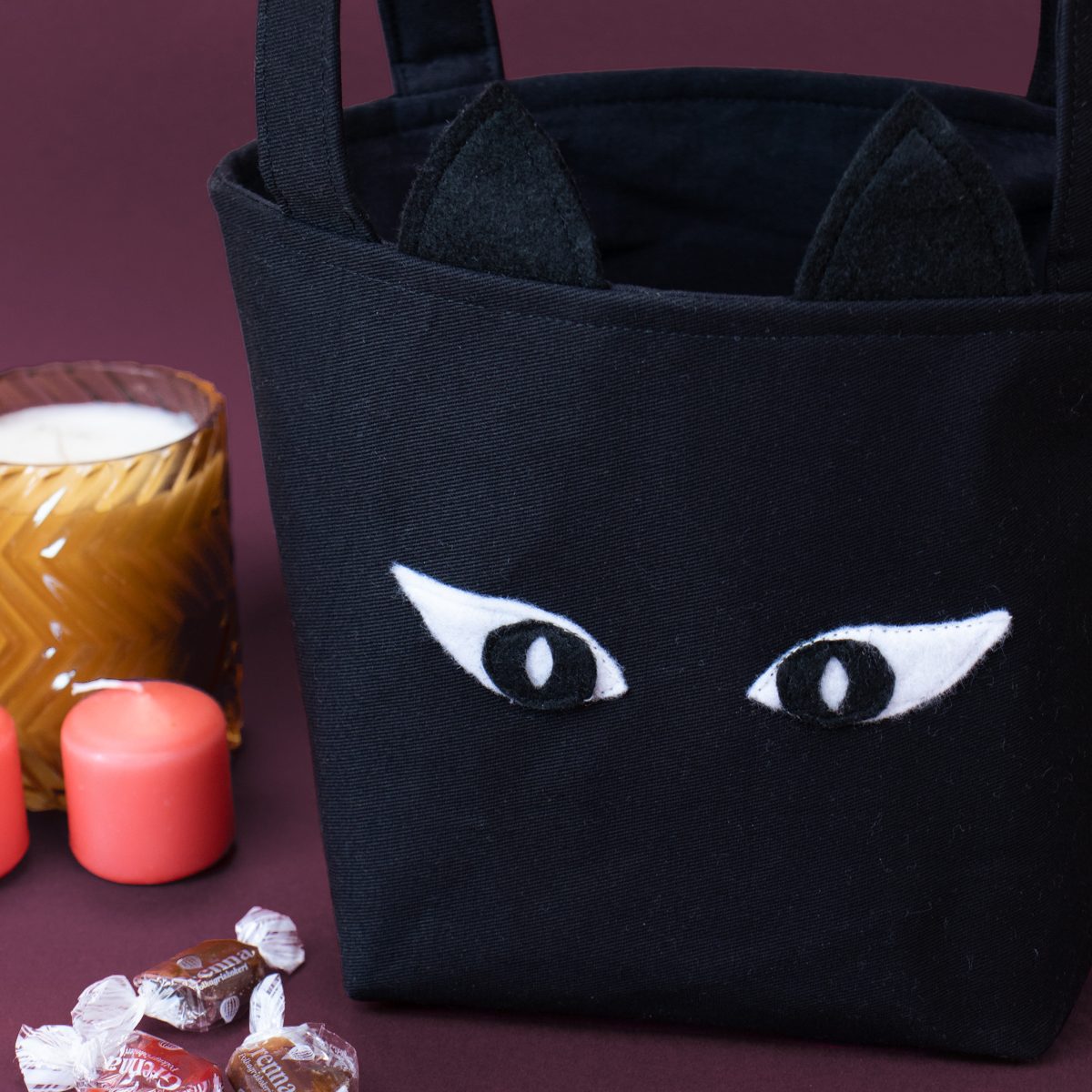 Remplacez les oreilles de lapin par des oreilles pointues de chat noir et ajoutez des yeux en feutrine noire et blanche 🎃 ! Ce modèle a été réalisé en coton sergé noir et doublure en coton noir. On vous propose également sur le blog, un tuto de sac à bonbon Citrouille !