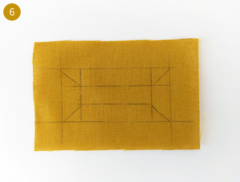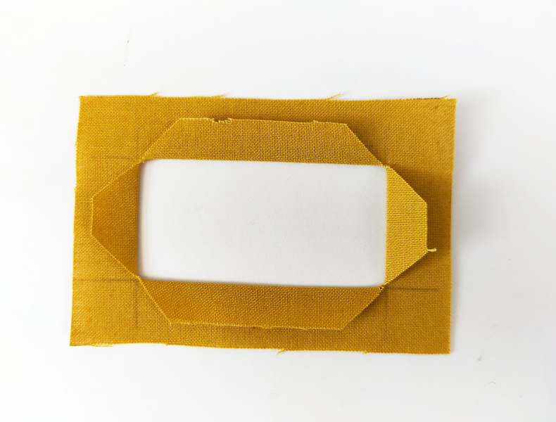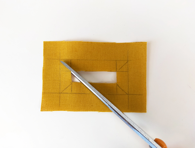 Créez l’ouverture en coupant le petit rectangle qui se situe au centre et coupez également sur les traits en oblique en veillant à ne pas dépasser au-delà des angles. Puis, ouvrez les marges de couture en les couchant vers l’envers de votre rectangle et repassez soigneusement.