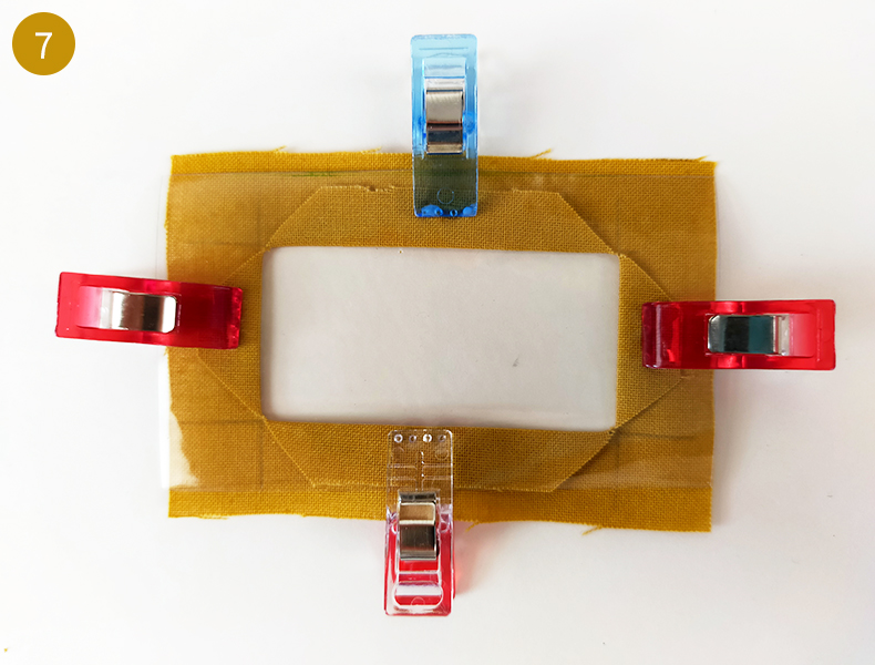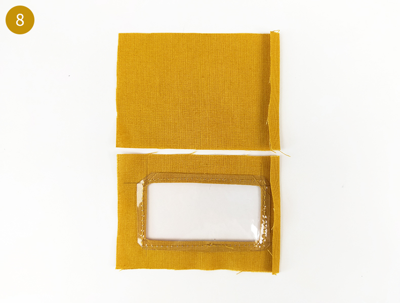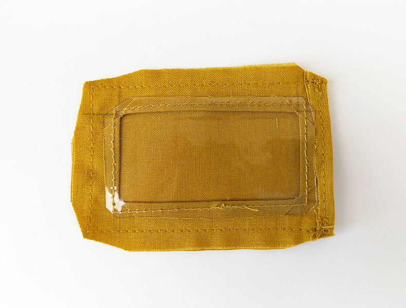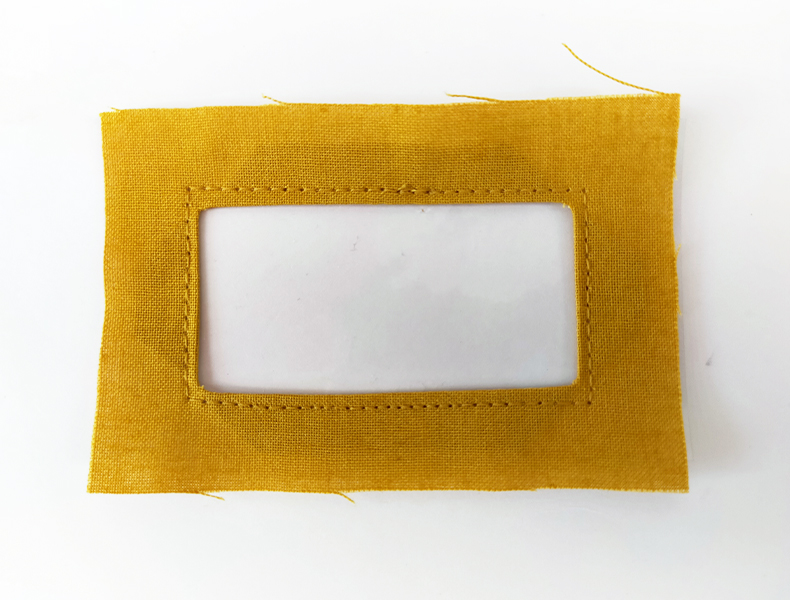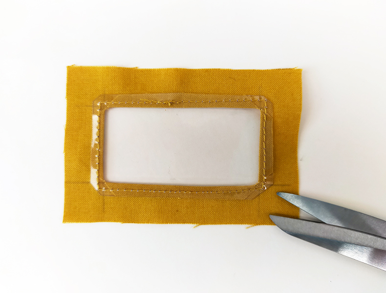 Pour protéger l’étiquette en papier, il faut ajouter un petit morceau de tissu cristal transparent. Positionnez-le contre l’envers de l’étiquette et veillez à ce que le cadre vide soit entièrement recouvert. Maintenez en épinglant avec des pinces puis, sur l’endroit, réalisez une surpiqûre à 2 mm tout autour de l’ouverture afin de maintenir le cristal sur le porte-étiquette. Une fois la surpiqûre réalisée, découpez le surplus de tissu et de cristal sur l’envers.