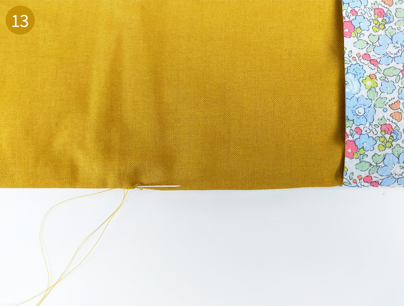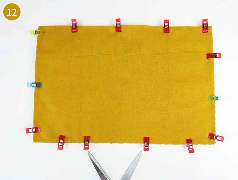 À l’aide de pinces, maintenez les épaisseurs ensemble au niveau des petits côtés des rabats puis piquez à 5 mm du bord afin de les maintenir en place. Faites cela pour les deux rabats.