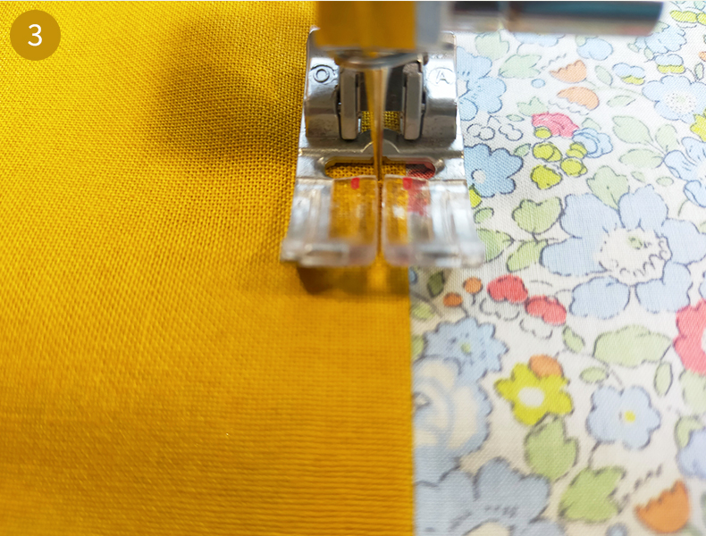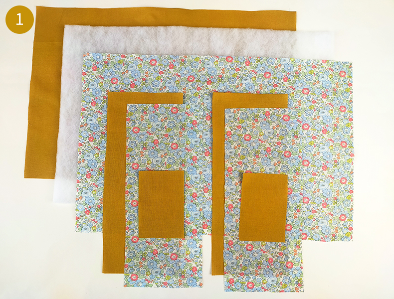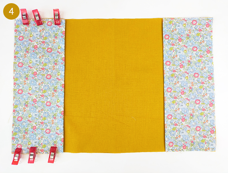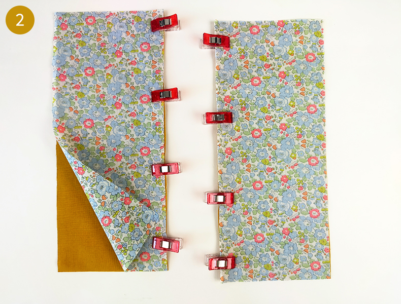 Premièrement, commencez par la couture des rabats. Positionnez endroit contre endroit 1 rabat en tissu liberty et 1 rabat en tissu uni. Assemblez sur une longueur à l’aide de pinces et piquez à 1 cm du bord.
