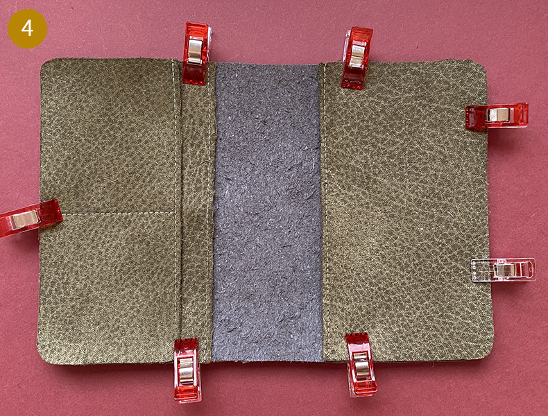 Positionnez envers contre envers les 2 pièces « grand côté » de chaque côté de l’étui : côté carte à gauche et côté passeport à droite.