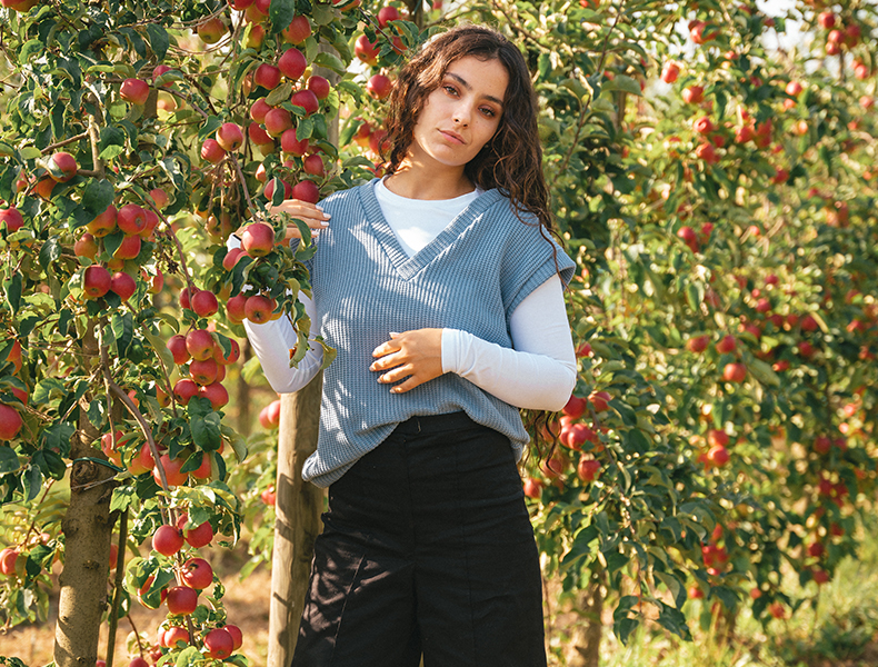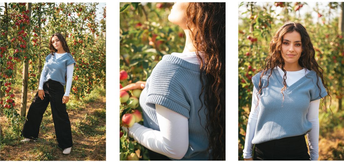 Pour ce tuto pull sans manche femme, on a décidé d’opter pour une maille côtelée en couleur bleuet, une des couleurs dominantes de notre thématique de Septembre : Slow Septembre. À vous de choisir ce qui vous convient le mieux : des côtes, des torsades… !