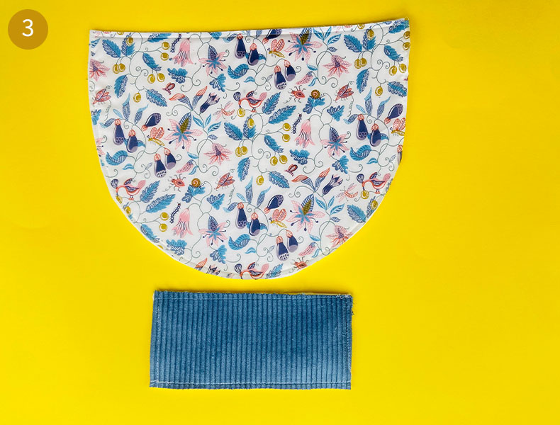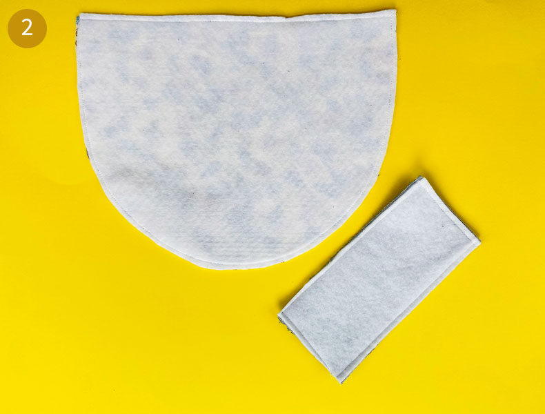 Thermocollez un des deux rabats Liberty avec votre entoilage H640. Si vous choississez un entoilage ou molleton non-thermocollant, réalisez une couture à 0,5 cm du bord pour maintenir vos deux tissus ensemble. Répétez cette opération avec l’anse en velours.