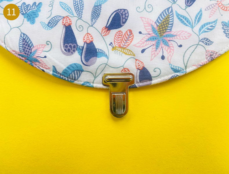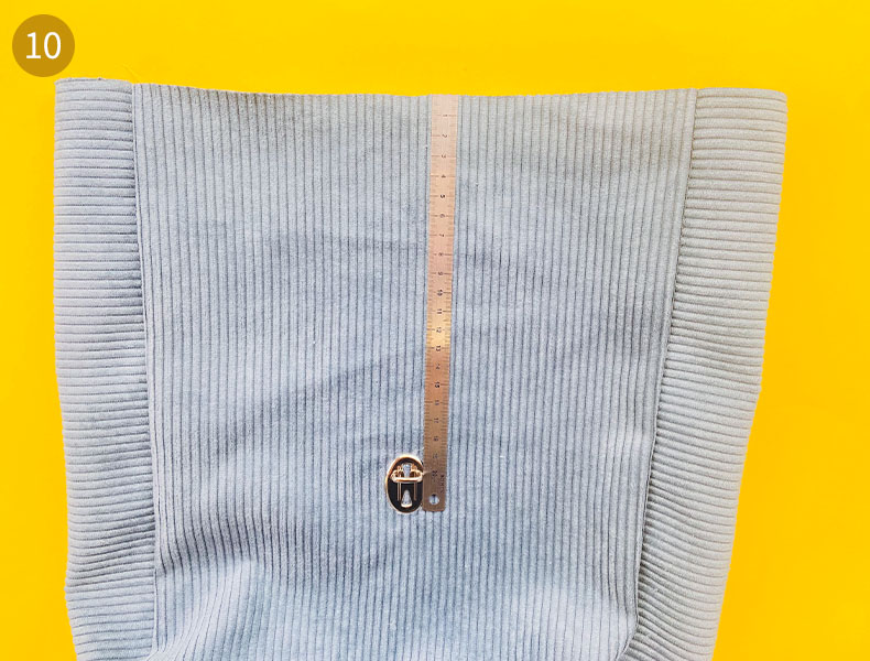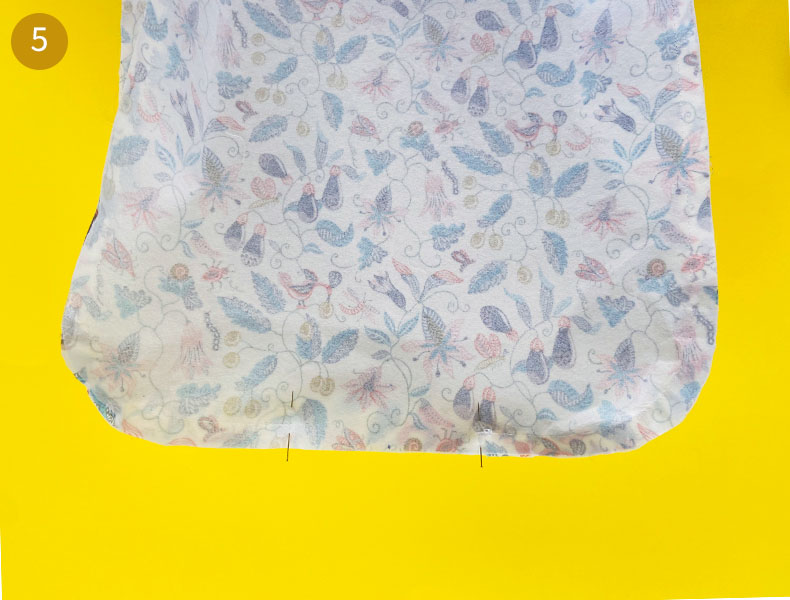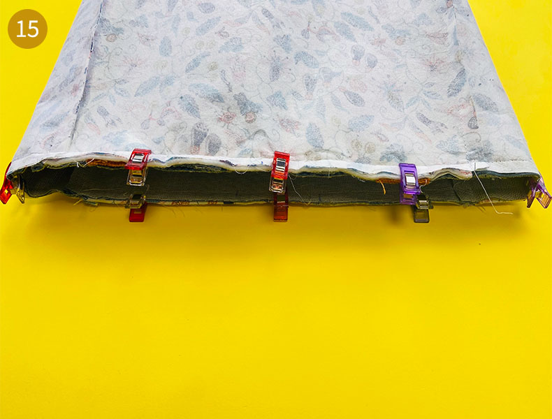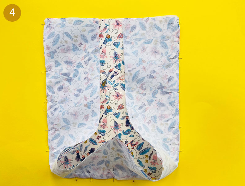 Premièrement, épinglez le rabat endroit contre endroit sur le dos du sac.
