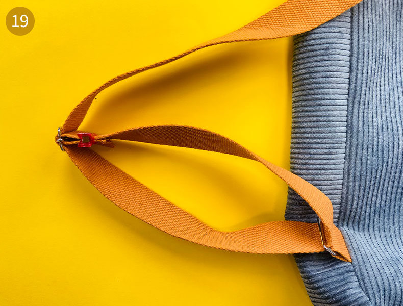 Pour finir, insérez la boucle coulisse dans une bretelle et passez dans la boucle rectangle ; repassez le bout de la bretelle dans la boucle réglable puis coudre à 1 cm de votre boucle coulisse.