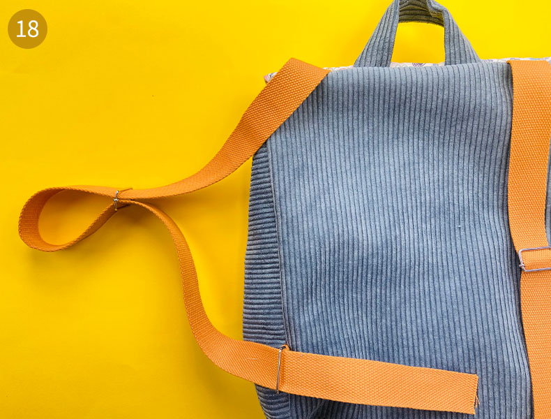 Épinglez endroit contre endroit la bande sur le devant et le dos du sac à dos en faisant coïncider les milieux. Piquez à 1 cm en renforçant la couture sur les passants et retournez sur l’endroit
