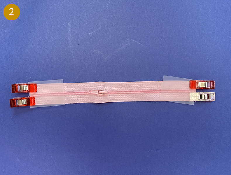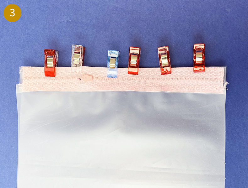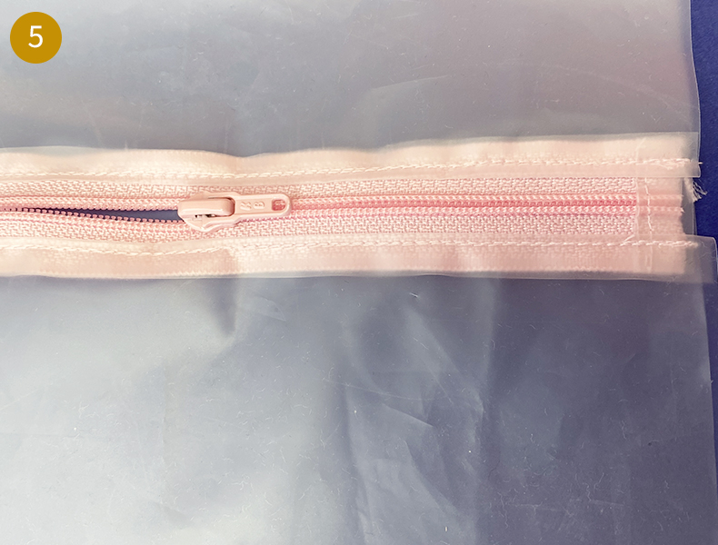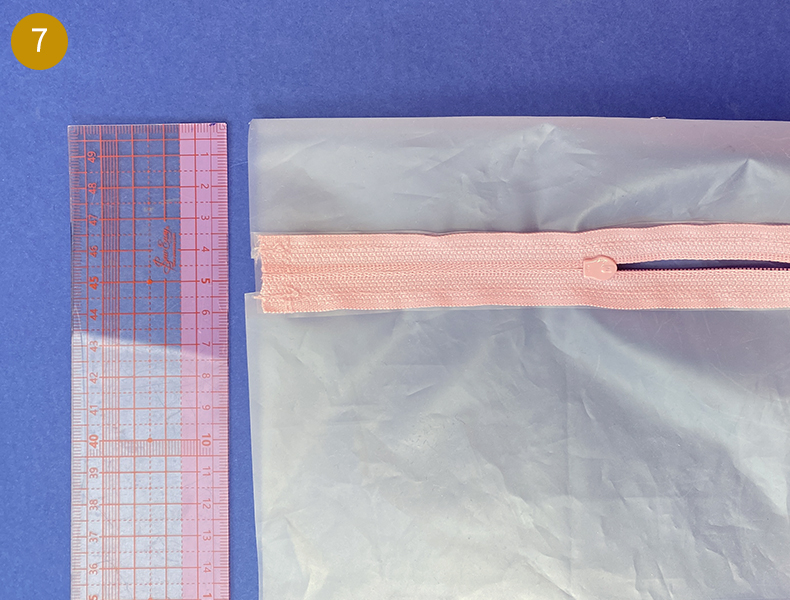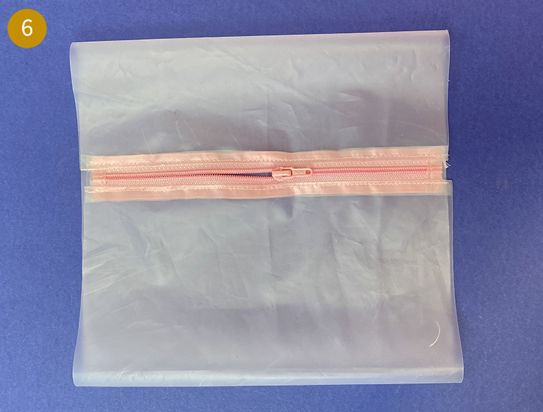 Coudre un petit côté du grand rectangle endroit contre endroit (même si en réalité, ce tissu film alimentaire lavable n’a pas d’endroit ou d’envers) sur un côté du zip à 0,5 cm du bord. Rabattre le film transparent et surpiquer la couture pour plus de propreté. Puis faire de même pour l’autre côté du zip.