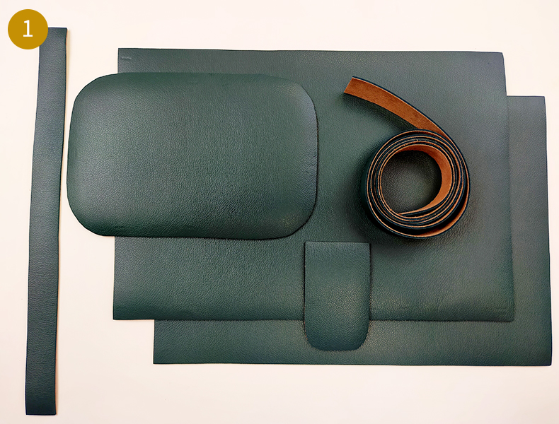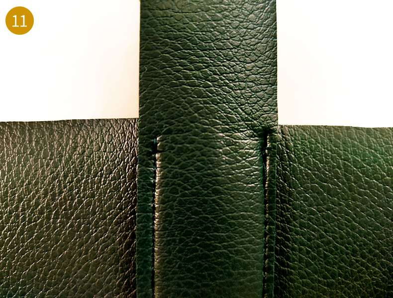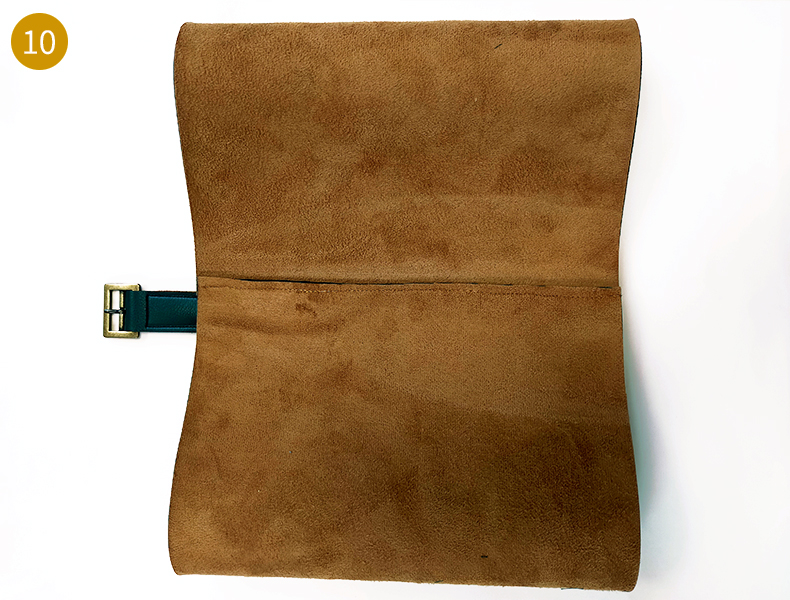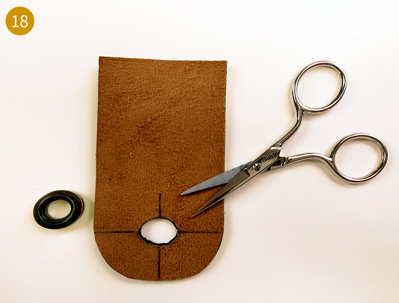 Sur l’envers du rabat, tracez une ligne parallèle à 2 cm du bord arrondi. Dessinez une ligne perpendiculaire passant par le milieu. Tracez l’ovale correspondant à votre fermoir et découpez-le. À l’aide d’un marteau, posez votre fermoir.