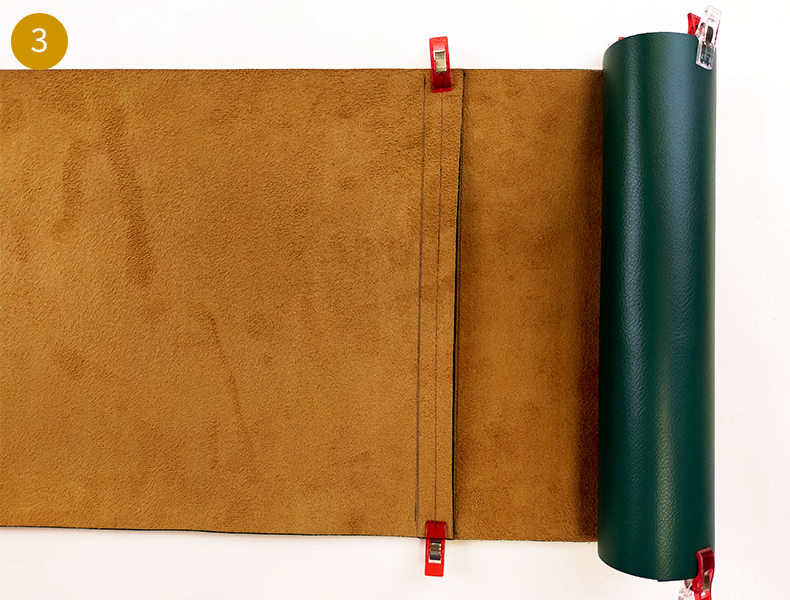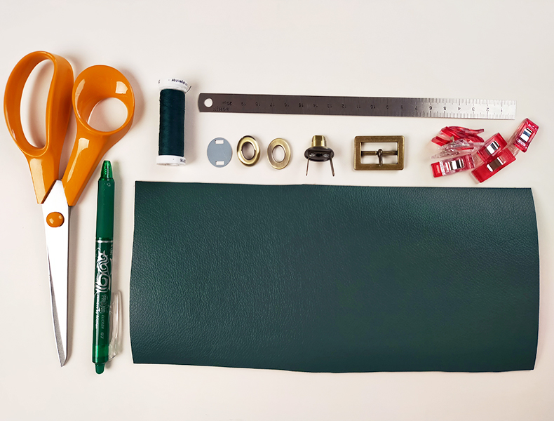 - Le recto et le verso du simili cuir préconisé étant contrastés, si vous souhaitez un rendu assorti de chaque côté de votre simili, il est possible de changer vos fils de canette et de bobine au fur et à mesure du montage.