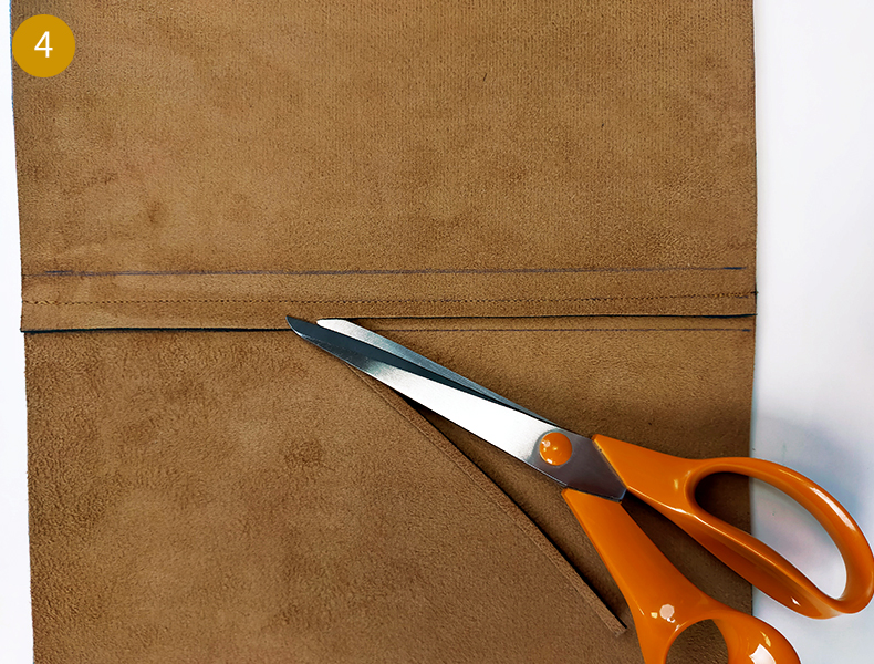 Une fois la couture réalisée, dégarnissez (face marron et face verte) les marges de couture de 5 mm.