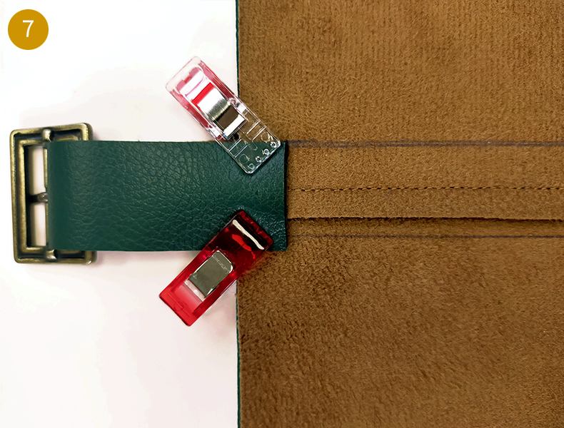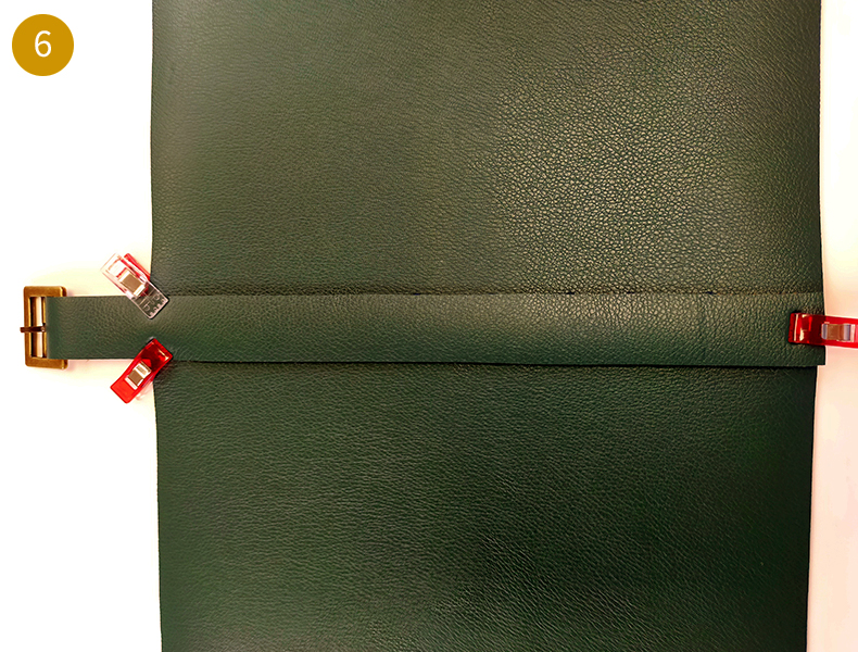 Passez le haut de votre anse dans la boucle ceinture et faites-la ressortir vers l’intérieur du sac. Épinglez la lanière sur le haut afin que l’extrémité de la lanière se retrouve à 1 cm du bord du haut du sac (côté intérieur). Attention : positionnez la boucle dans le bon sens.