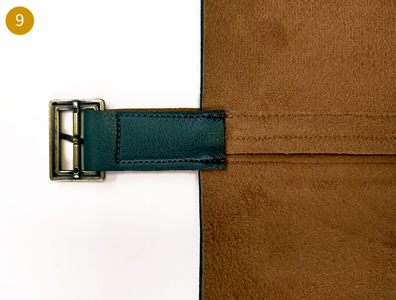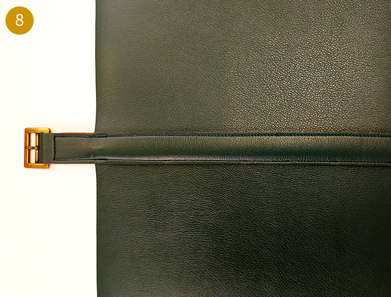 Sur l’endroit, piquez à 2 mm du bord tout autour de la lanière. Commencez par le bas, passez au plus près de la boucle en parallèle de celle-ci puis cousez de l’autre côté en redescendant.