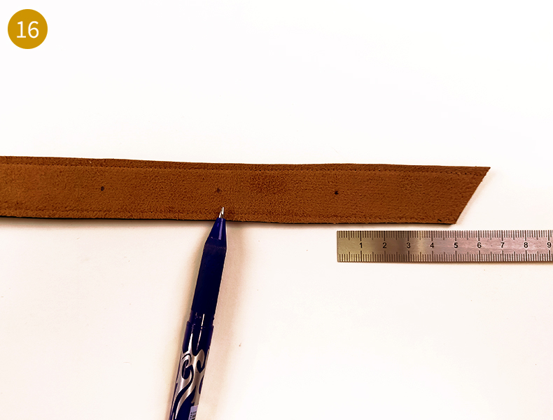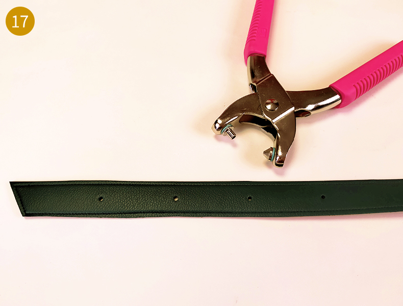 Reportez les repères des trous sur votre lanière, ici, nous avons opté pour 4 trous, mais vous pouvez les adapter selon vos besoins. Réalisez les trous à l’aide d’une pince vario Prym, une pince à percer.