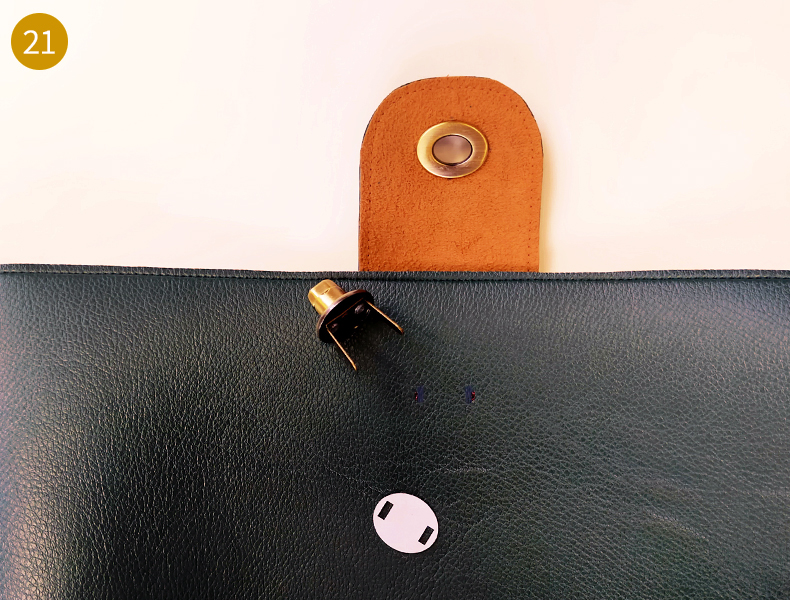 Insérez le tourniquet dans le fermoir. Tournez afin qu’il reste en place. Refermez le rabat vers le devant du sac et repérez avec le stylo frixion l’emplacement des deux agrafes du tourniquet. Fendez au niveau des repères, insérez votre fermoir par les trous, positionnez la petite partie métallique puis fermez les agrafes l’une sur l’autre…