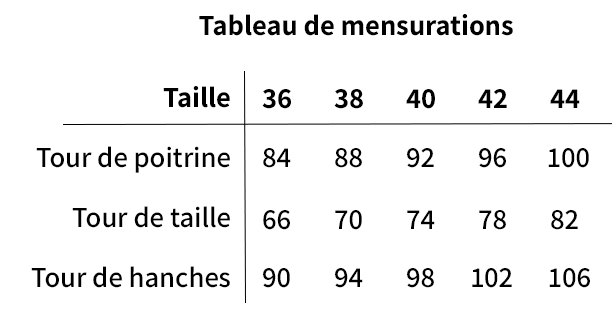 Bonjour, Merci pour votre commentaire. Nous avons mis à jour notre article avec le tableau des mensurations. Belle journée à vous !