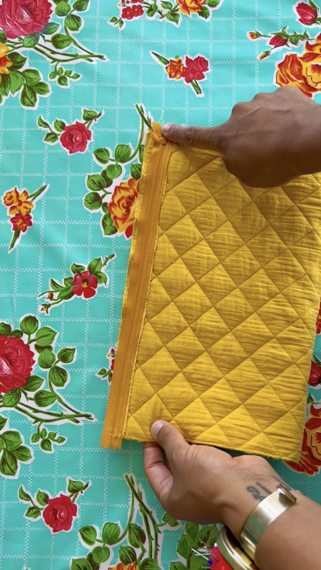 Sur le côté qui mesure 35 cm, épinglez endroit contre endroit votre fermeture à glissière à votre tissu. Une fois cousu, vous pouvez surpiquer le long de la couture à 0,5cm du bord pour un joli rendu et bien plaquer le tissu et le zip ensemble.