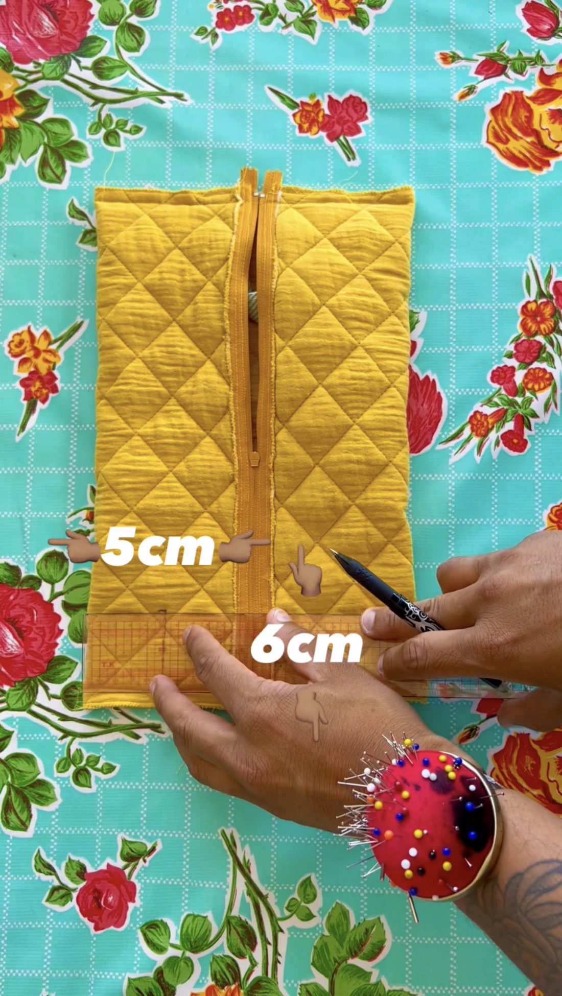 Faites de même de l’autre côté : endroit contre endroit, épinglez le zip à l’autre côté du tissu, cousez puis surpiquez à 0,5 cm du bord.