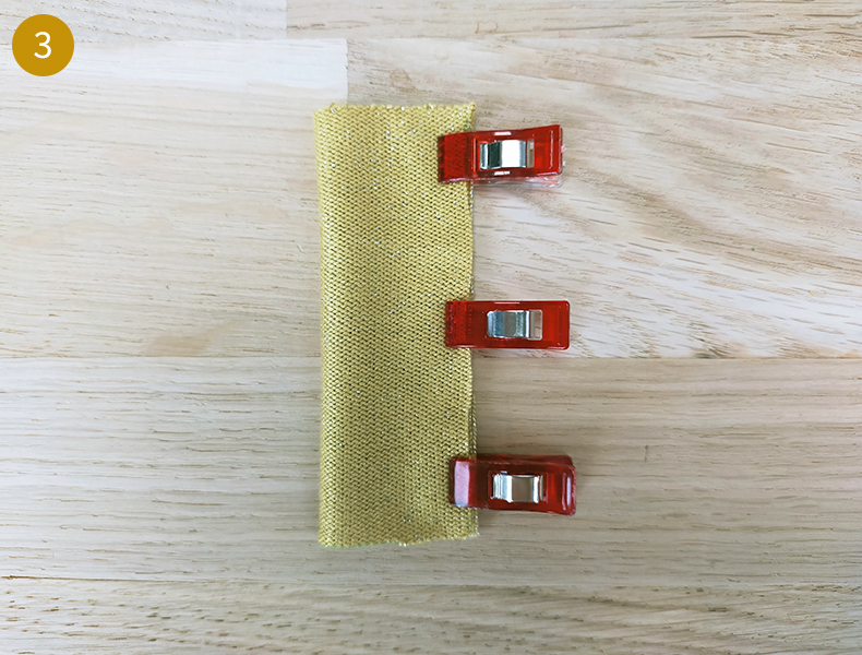 Approchez les plis du trou bord à bord l’horizontale. La languette doit se retrouver prise en sandwich. Veillez aussi à ce qu’elle ne vrille pas. Épinglez pour bien maintenir.