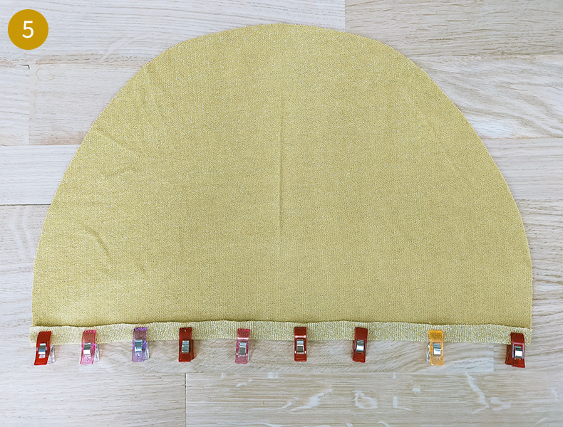 Endroit contre endroit, et bord à bord, épinglez le turban sur le bas. Piquez  sur 1,5 cm juste au-dessus de l’ourlet (ici sur la photo, au niveau de la pince).