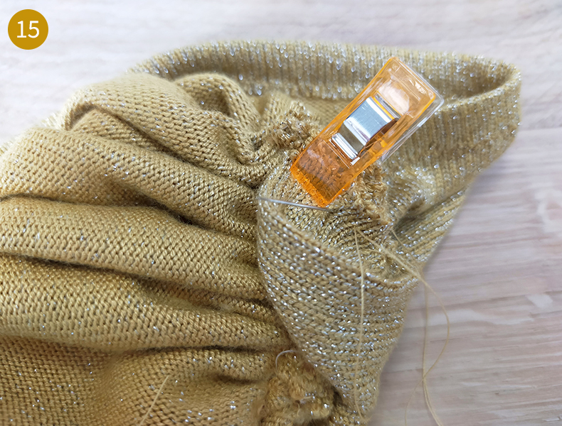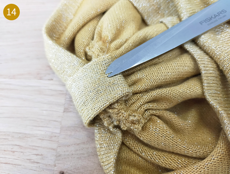 Tirez les fils de chaque côté afin de créer les fronces et de donner sa forme au turban. Pour les garder dans cette position, nouez les extrémités de votre fil de fronces.